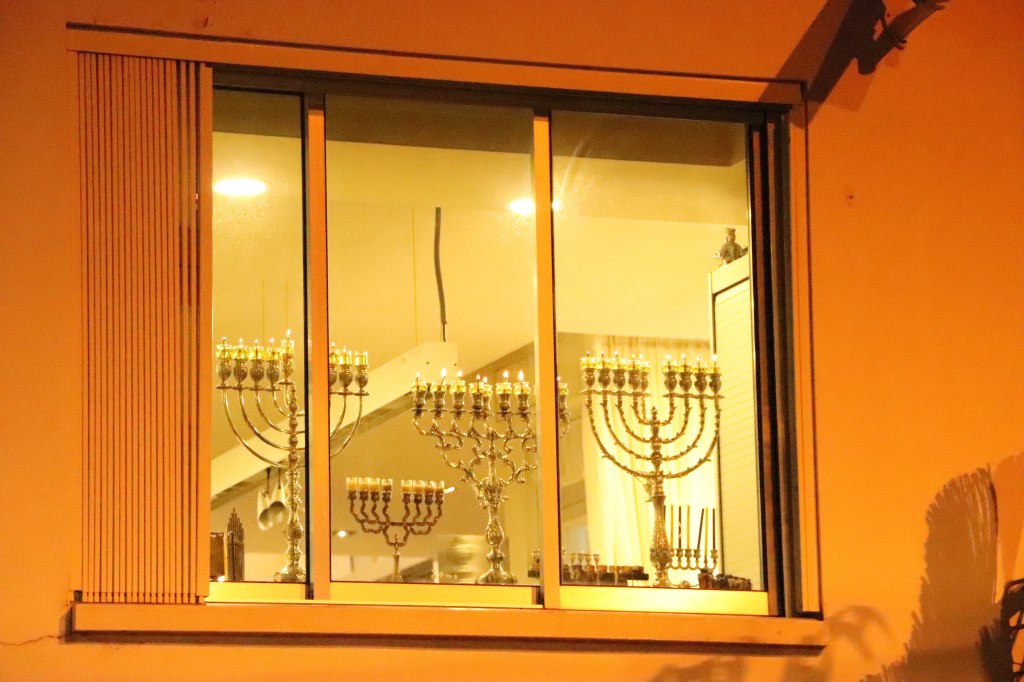 כשפונים שמאלה רואים ממול בית אשר לו חלון גדול מאד ועליו מוצבות הרבה מאד חנוכיות. באחד הסיורים היתה לנו חוויה מאד נעימה בבית הזה. הם ראו אותנו עומדים על המדרכה והזמינו אותנו להכנס.